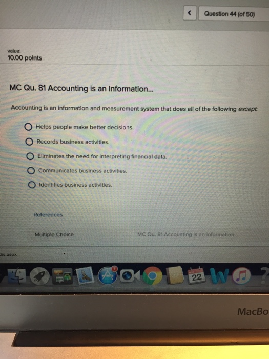 Accounting is an information and measurement system that does all of the following except a Records business activities b Communicates business activities c Does not use technology to improve accuracy in reporting d Helps people make better decision 14. Accounting is an information and measurement system that identifies records and communicates relevant reliable and comparable information about an organizations business activities. Accounting is an information and measurement system that does all of the following except.