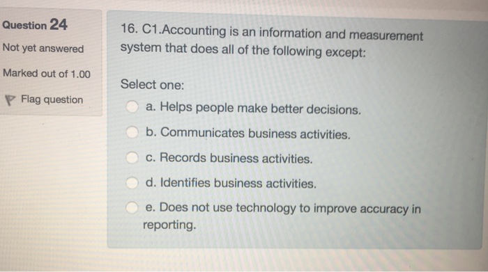 Le make better decisions. Does not use technology to improve accuracy in reporting. 15 Accounting is an information and measurement system that does all of the following except.